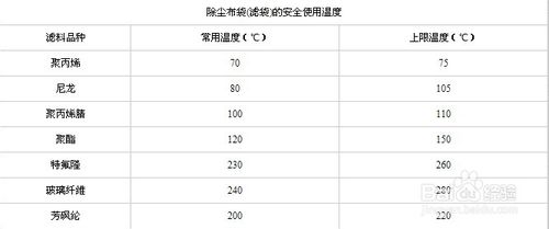表列出了可連續(xù)使用兩年的除塵布袋(濾袋)常用溫度,以及考慮到由于管理上偏差而允許的上限溫度。