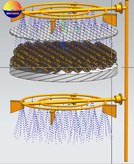 為了避免氣體攜走噴淋液,在塔頂部氣水分離器,有效截留噴淋液。噴淋液循環(huán)使用,在使用過(guò)程中會(huì)有部分損失,位于塔底的循環(huán)水箱適時(shí)補(bǔ)充噴淋液。、