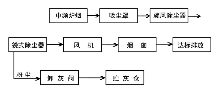 ⑤中頻爐密閉罩風(fēng)管合并后引出廠房至除塵器。