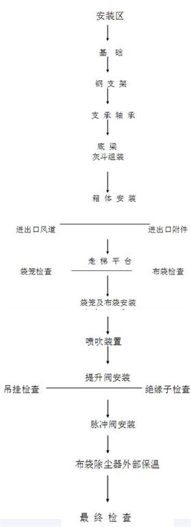 由于布袋除塵器是大型戶外設(shè)備,安裝現(xiàn)場(chǎng)的情況和條件各不相同,施工單位的人工智能員和機(jī)具條件也不盡相同,所以各施工單位可以根據(jù)以下我們提供的常見布袋除塵器安裝順序有選擇進(jìn)行施工。布袋除塵器的支架有鋼結(jié)構(gòu)和鋼筋混凝土兩種形式,灰斗的保溫有蒸氣加熱和電加熱兩種形式,安裝時(shí)以提供的設(shè)計(jì)圖紙要求為準(zhǔn)。安裝順序如下: