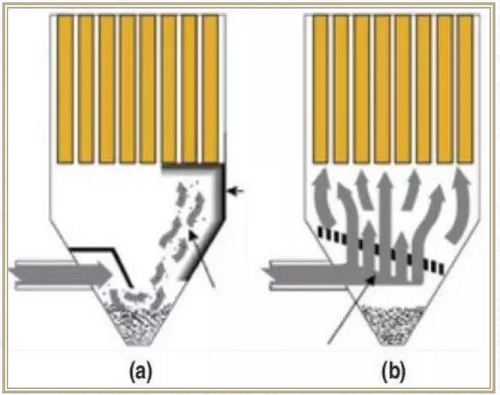 進(jìn)入料斗底部區(qū)域的氣流可能導(dǎo)致料斗中的顆粒向上旋轉(zhuǎn)并重新夾帶在過(guò)濾介質(zhì)中。當(dāng)與進(jìn)料結(jié)合時(shí),從料斗重新攜帶的物料在濾袋上產(chǎn)生_的顆粒負(fù)載。如果進(jìn)料直接通過(guò)狹窄的料斗,則與進(jìn)料口相對(duì)的側(cè)壁上可能發(fā)生過(guò)度的磨損。