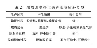 在輸煤過(guò)程和燃燒過(guò)程會(huì)產(chǎn)生大量的煙氣粉塵,燃煤電廠生產(chǎn)過(guò)程中也會(huì)產(chǎn)生很多粉塵,主要有煤塵、石灰石粉塵、石膏粉塵及矽塵等。在一般生產(chǎn)過(guò)程中粉塵的產(chǎn)生場(chǎng)所和粉塵類型見表2。