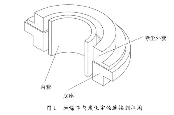 1.1加煤車與炭化室的連接6m 焦?fàn)t加煤車根據(jù)焦?fàn)t狀況,一般設(shè)置有四套加煤裝置,分別對應(yīng)四個加煤口。在加煤時(shí),加煤裝置的內(nèi)套進(jìn)入加煤口,除塵裝置外套與加煤口底座對接,內(nèi)套和除塵裝置外套之間形成除塵通道。如圖 1 所示。