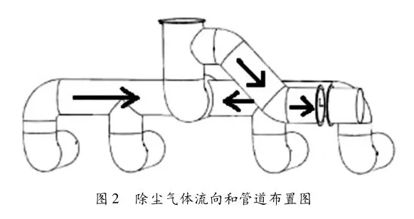 加煤車除塵管道由除塵裝置外套開始,經(jīng)支管、總管,通過導(dǎo)套與地面除塵站連接。氣體流向及除塵管道布置如圖 2 所示。