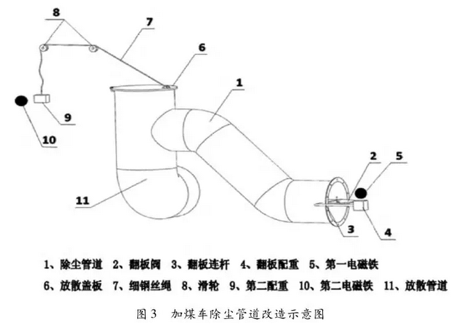(1)在加煤車除塵放散管后管道內(nèi)安裝翻板閥,翻板閥外設(shè)置翻板配重。