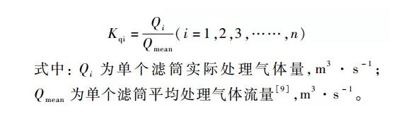 濾筒的流量分配系數(shù)是指每個(gè)濾筒實(shí)際處理氣體流量與平均處理氣體流量的比值,該參數(shù)可有效反應(yīng)單個(gè)濾筒的實(shí)際過(guò)濾情況,記作Kqi,其公式表示為: