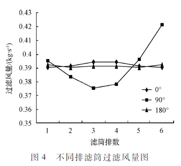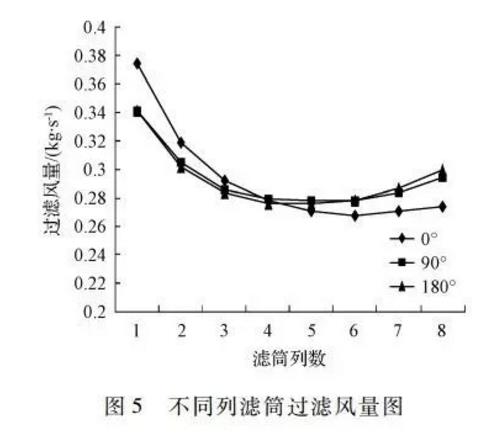 流場(chǎng)在相同的總過(guò)濾風(fēng)量下,出口位置會(huì)導(dǎo)致與之鄰近的濾筒的過(guò)濾風(fēng)量的提高,進(jìn)出口夾角為180°時(shí)氣流分布均勻