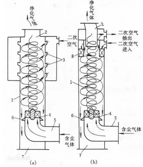 旋風(fēng)除塵器的工作原理如下圖所示,含塵氣體從入口導(dǎo)入除塵器的外殼和排氣管之間,形成旋轉(zhuǎn)向下的外旋流。懸浮于外旋流的粉塵在離心力的作用下移向器壁,并隨外旋流轉(zhuǎn)到除塵器下部,由排塵孔排出。凈化后的氣體形成上升的內(nèi)旋流并經(jīng)過排氣管排出。