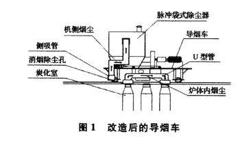 導(dǎo)煙車是U型管導(dǎo)煙技術(shù)的核心,主要包括兩個(gè)部分:側(cè)導(dǎo)系統(tǒng)和側(cè)吸系統(tǒng)。側(cè)導(dǎo)系統(tǒng)是把裝煤過(guò)程的煙塵導(dǎo)入相臨炭化室的裝置,由U型管、提升裝置組成。側(cè)吸系統(tǒng)是收集、處理機(jī)側(cè)爐門逸散煙塵的裝置,由風(fēng)機(jī)、布袋除塵器、預(yù)噴涂系統(tǒng)、移動(dòng)式空壓機(jī)、側(cè)吸管等組成。為了確保側(cè)吸系統(tǒng)盡可能多的收集機(jī)側(cè)煙塵,在機(jī)側(cè)爐門上安裝了熱浮力罩,把逸散的煙塵匯集后通過(guò)側(cè)吸系統(tǒng)進(jìn)行處理。改造后的導(dǎo)煙車如圖: