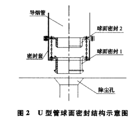 原U型管的材質(zhì)為不銹鋼制作,在作業(yè)過(guò)程中由于活動(dòng)套的起落不順暢們?cè)斐煽ㄗ璎F(xiàn)象,導(dǎo)致U型管密封效果差。針對(duì)這種情況我公司將U型管材質(zhì)改為鑄鋼,縮小導(dǎo)套直徑,增加壁厚,密封面采用球面密封,在球面密封外部加裝1個(gè)固定式密封套,形成雙層密封。改造后球面密封與除塵孔緊密結(jié)合,密封效果明顯,且抗熱變形的能力大大提高,在風(fēng)機(jī)吸力相同的情況下,U型導(dǎo)煙效果有了很大提升。