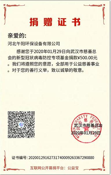 午陽環(huán)保心系武漢,為中國加油為武漢加油-河北午陽環(huán)保設備有限公司